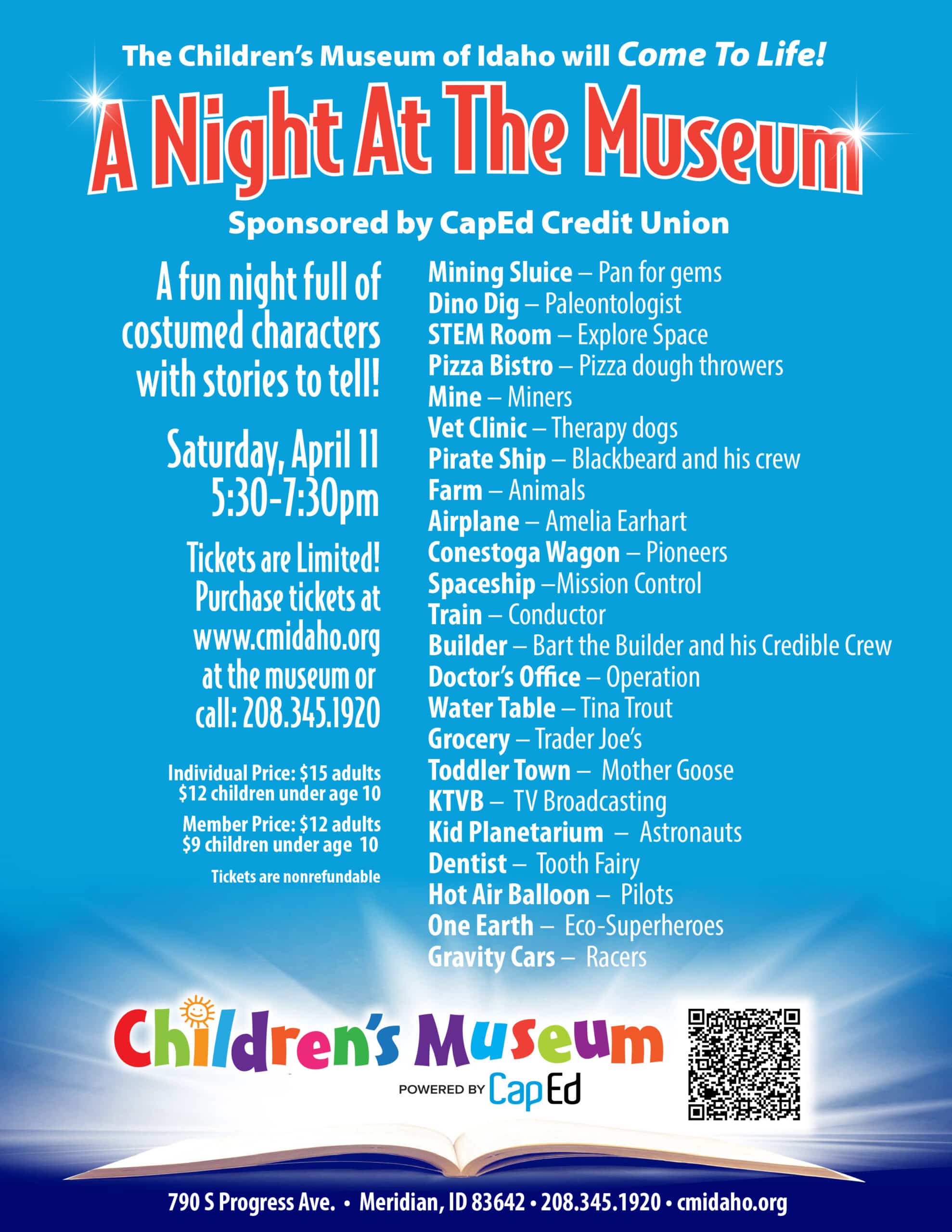 Families are invited to step into an evening of imagination and discovery as the Children’s Museum of Idaho presents “A Night at the Museum” on Saturday, April 11 from 5:30–7:30 p.m.
