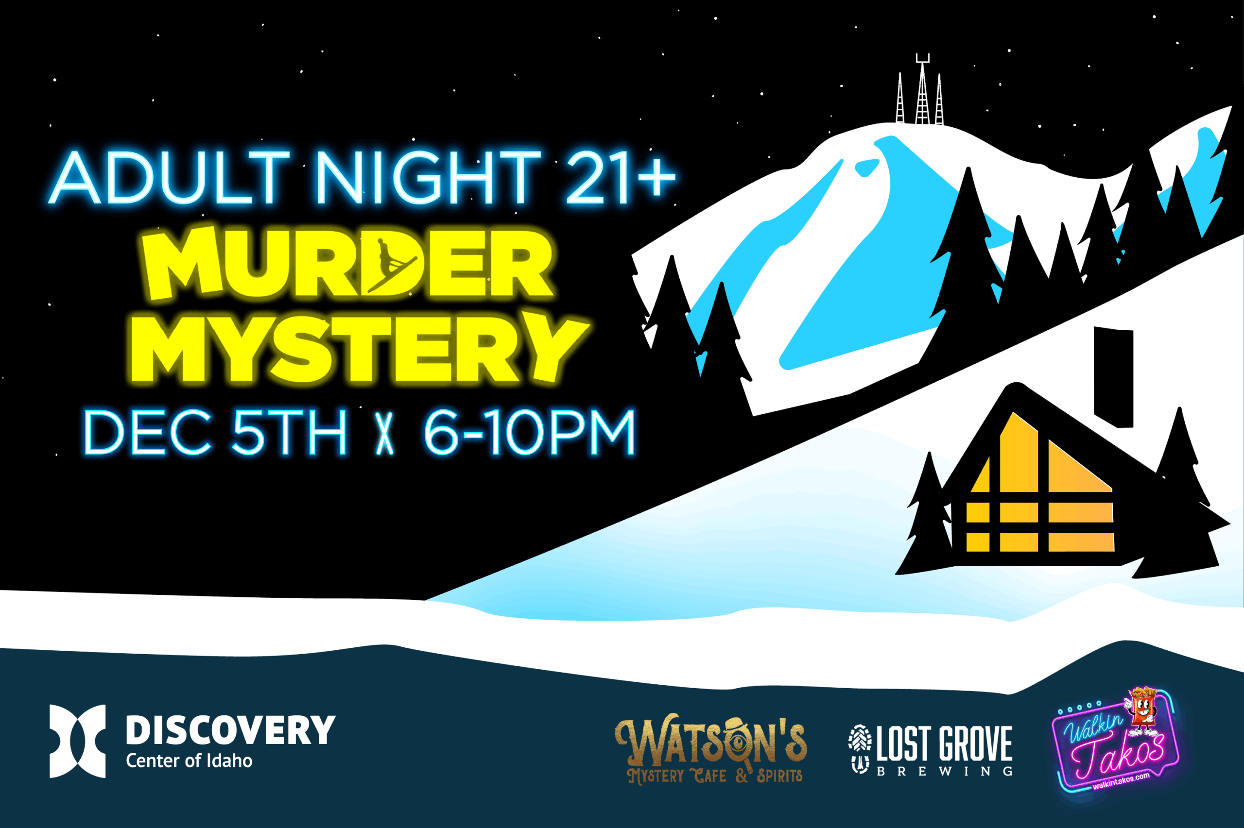 Join us for an evening of mystery at the Discovery Center of Idaho’s Adult Night: Murder Mystery, presented in partnership with Watson’s Mystery Café & Spirits. This event features a totally tubular 1980s ski resort theme. Come dressed in your best retro ski gear or full 80s fashion and help solve the night’s mystery.