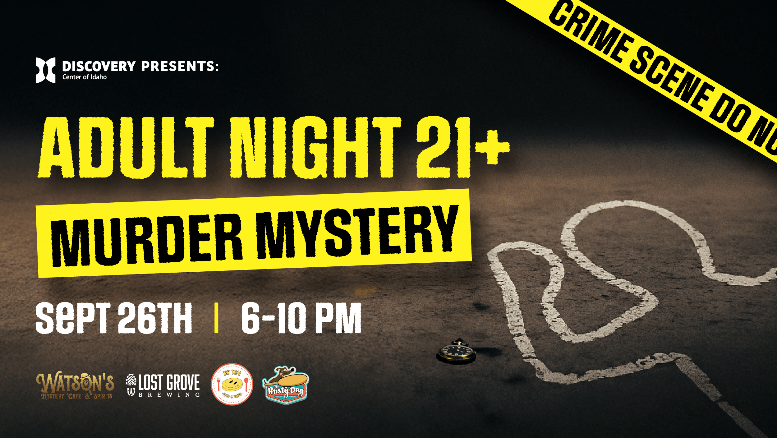 Step into a night of mystery and adventure at the Discovery Center of Idaho! Join us on Thursday, September 26, from 6–10 PM for a 21+ Adult Night: Murder Mystery presented with Watson’s Mystery Café & Spirits.