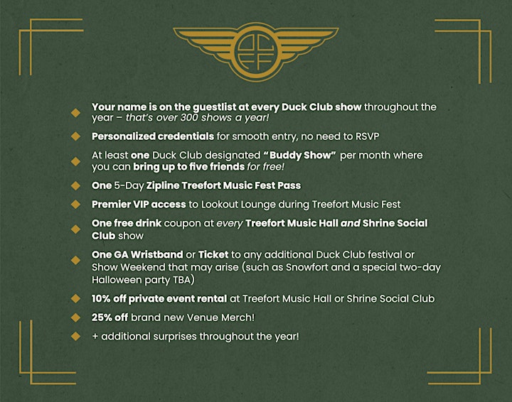 - One GA Wristband or Ticket to any additional Duck Club festival or Show Weekends that may arise (such as Snowfort, and a special two-day halloween party TBD)