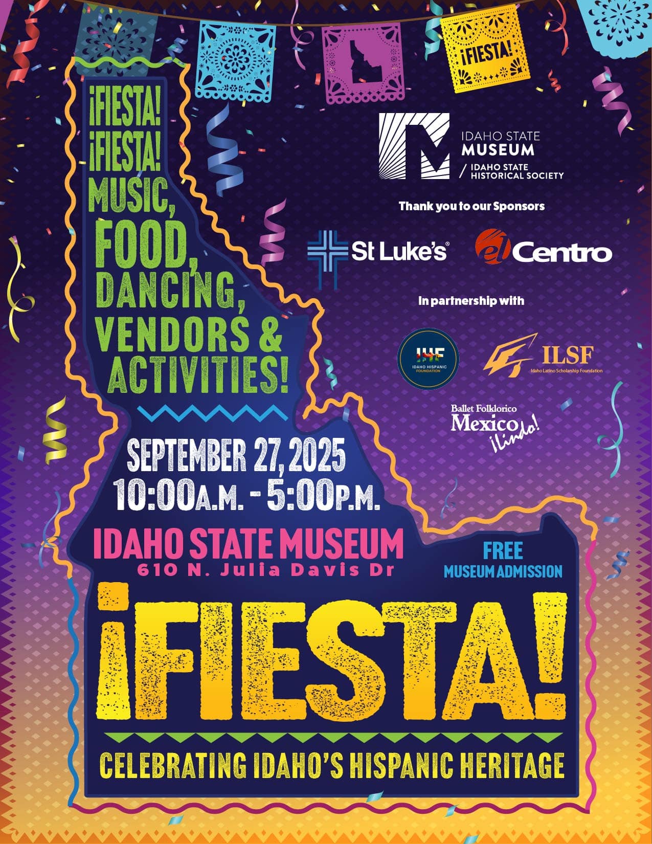 Join us the Idaho State Museum on September 27, 2025, from 10AM-5PM for ¡Fiesta!, a celebration of Idaho’s Hispanic heritage. This free, family-friendly event will feature music, performances, food, and activities for all ages.
