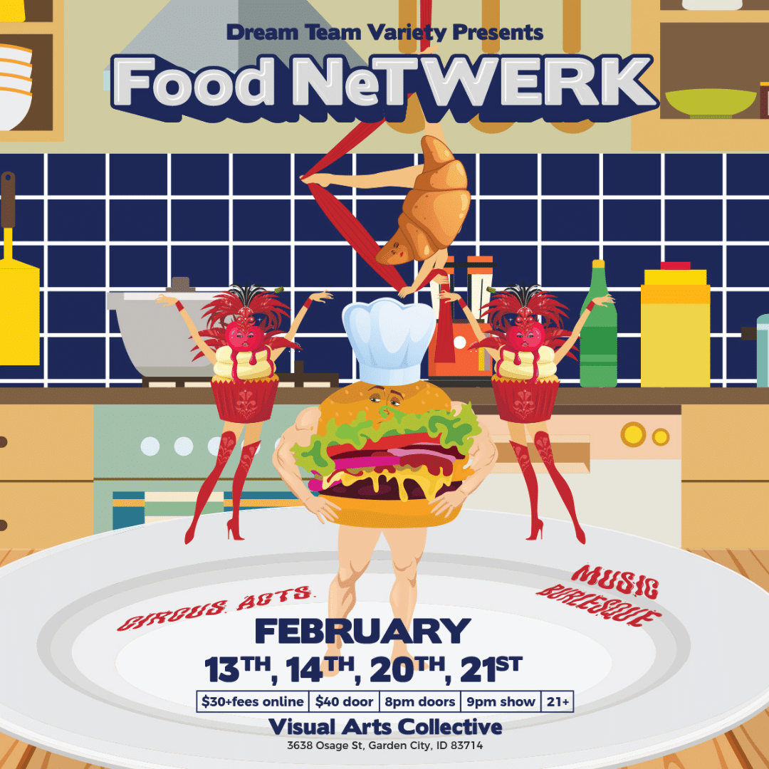 Welcome to Food NeTWERK – where culinary cravings collide with cabaret chaos and gravity-defying glamour! 🍽️✨ This isn’t your grandma’s cooking show (unless she moonlights on silks). Dream Team Variety serves up a saucy buffet of burlesque, beats, and bite-sized brilliance! Starring high-flying aerialists, steamy chefs, and musical morsels. Join us for this sizzling sexy variety show! February 13, 14, 20, and 21. Doors at 8pm, show starts at 9pm. Get your tickets today!