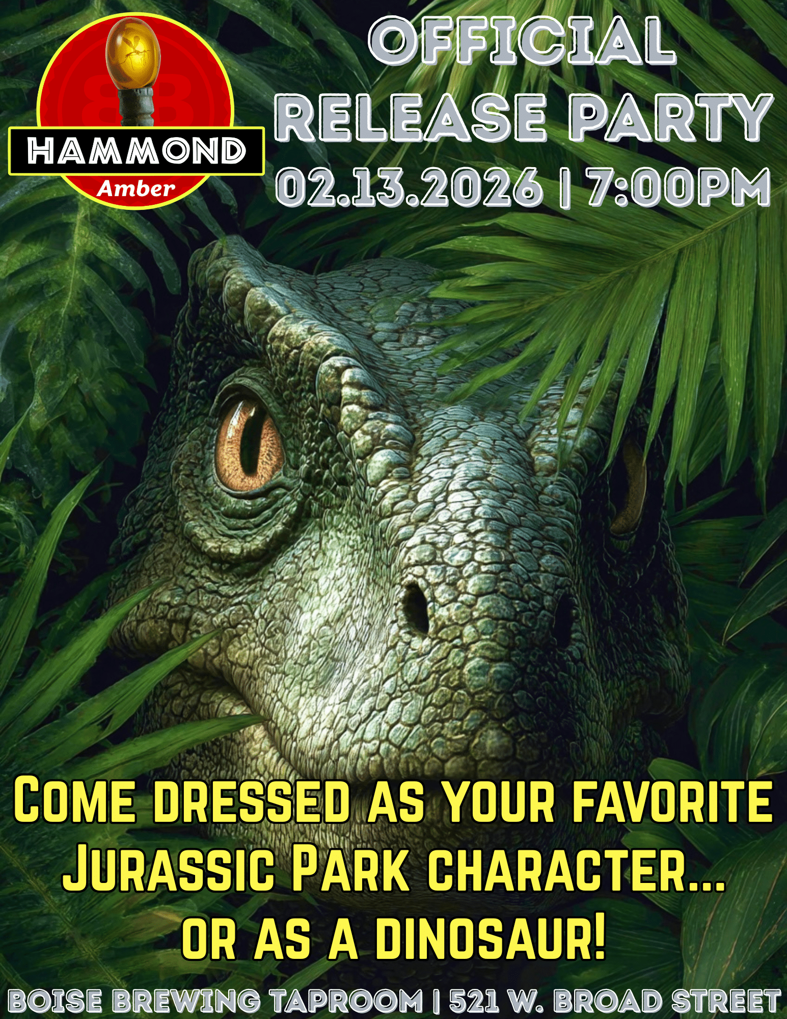Our new amber ale is named after Jurassic Park creator Dr. John Hammond. So it only makes sense to throw a Jurassic Park themed release party!