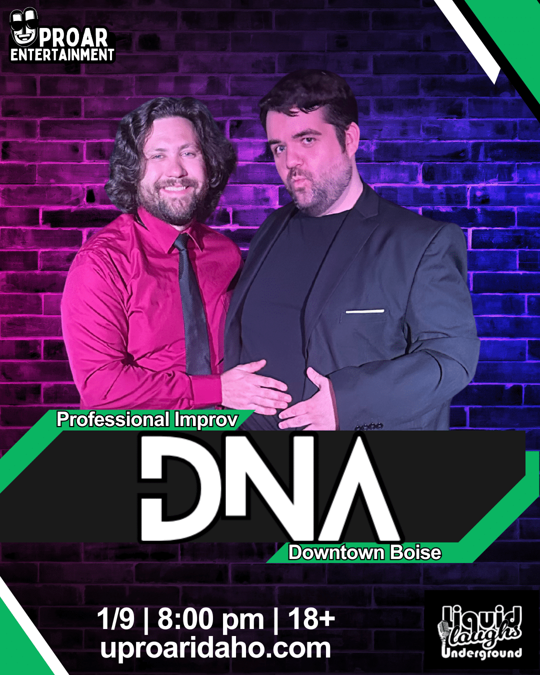 Produced by Uproar Entertainment—creating professional improv comedy since 2019—DNA is confident, high-energy, and never precious. No workshops. No half-ideas. Just smart performers taking big swings and seeing how far the story goes.