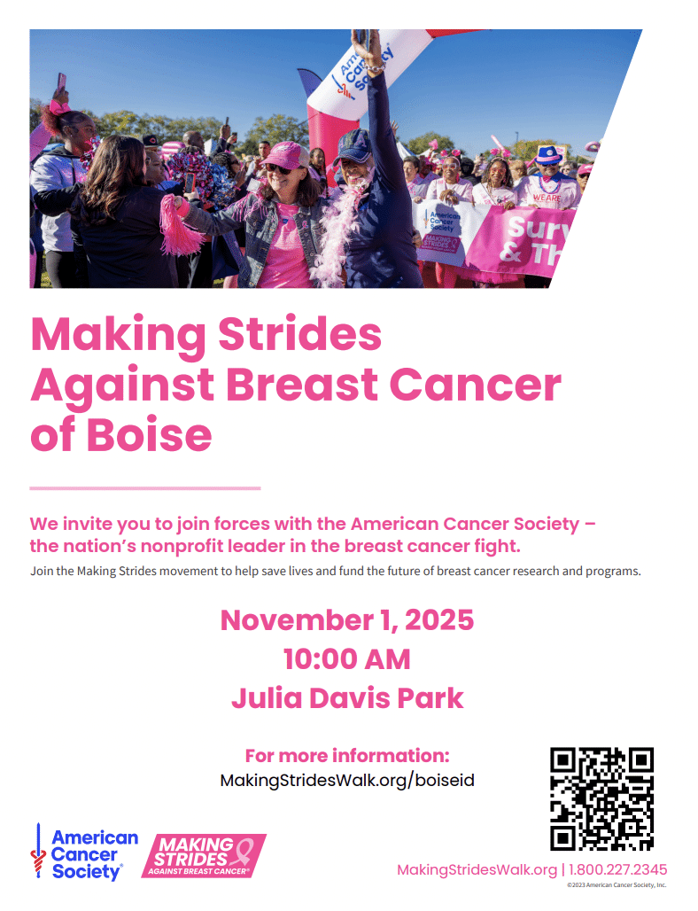 Get ready, Boise! The park will turn pink as our community comes together for an unforgettable day of hope, strength, and celebration at Making Strides Against Breast Cancer.