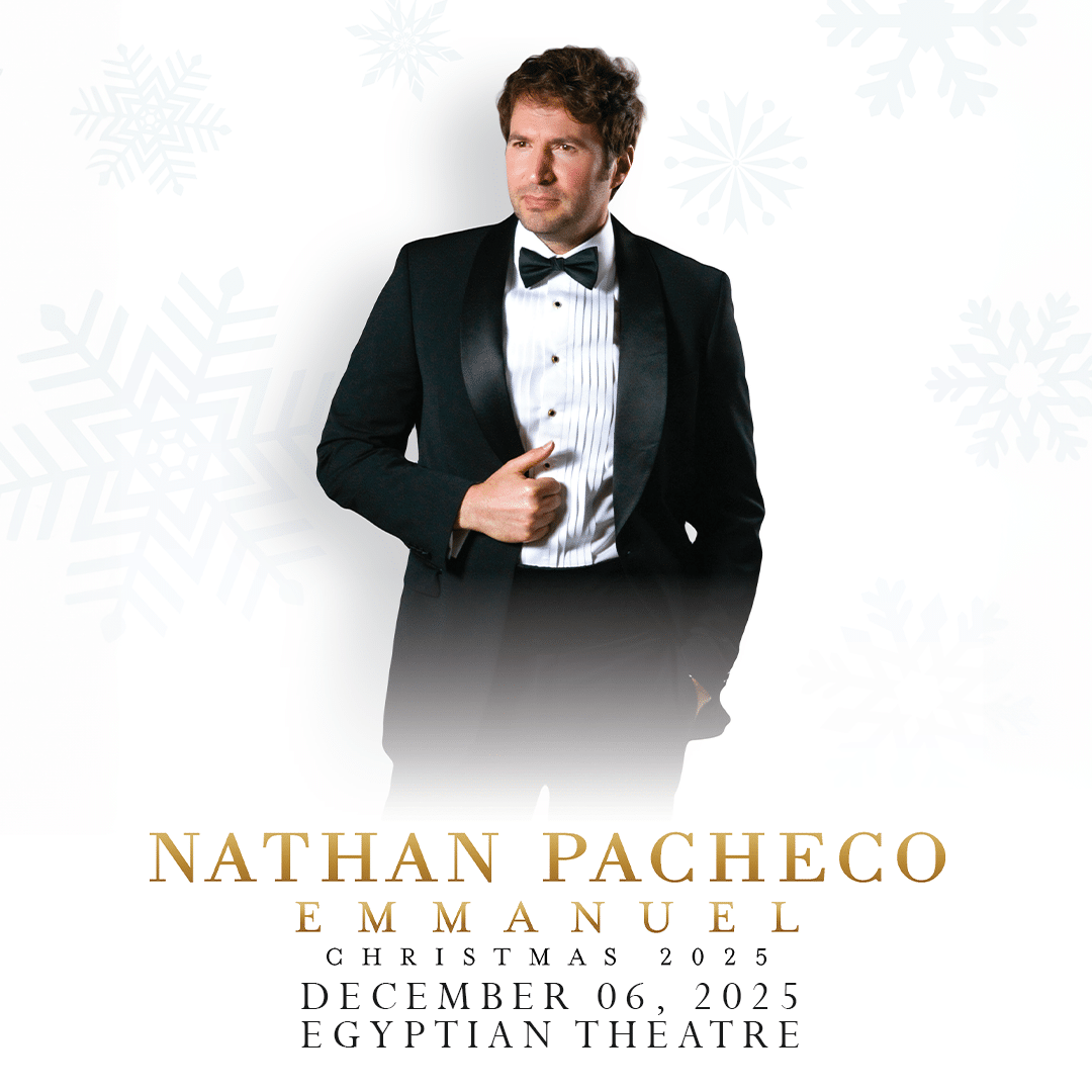 Nathan Pacheco returns to the Egyptian Theatre on December 6, 2025. Experience the wonder of the season with acclaimed tenor Nathan Pacheco in his 2025 holiday tour, "Emmanuel, Christmas 2025." This unforgettable evening features beloved Christmas classics, fan favorites, and the debut of his powerful new single, "Emmanuel." With soaring vocals in this moving performance, Nathan brings the true spirit of Christmas to life in a concert that will uplift and inspire the whole family.