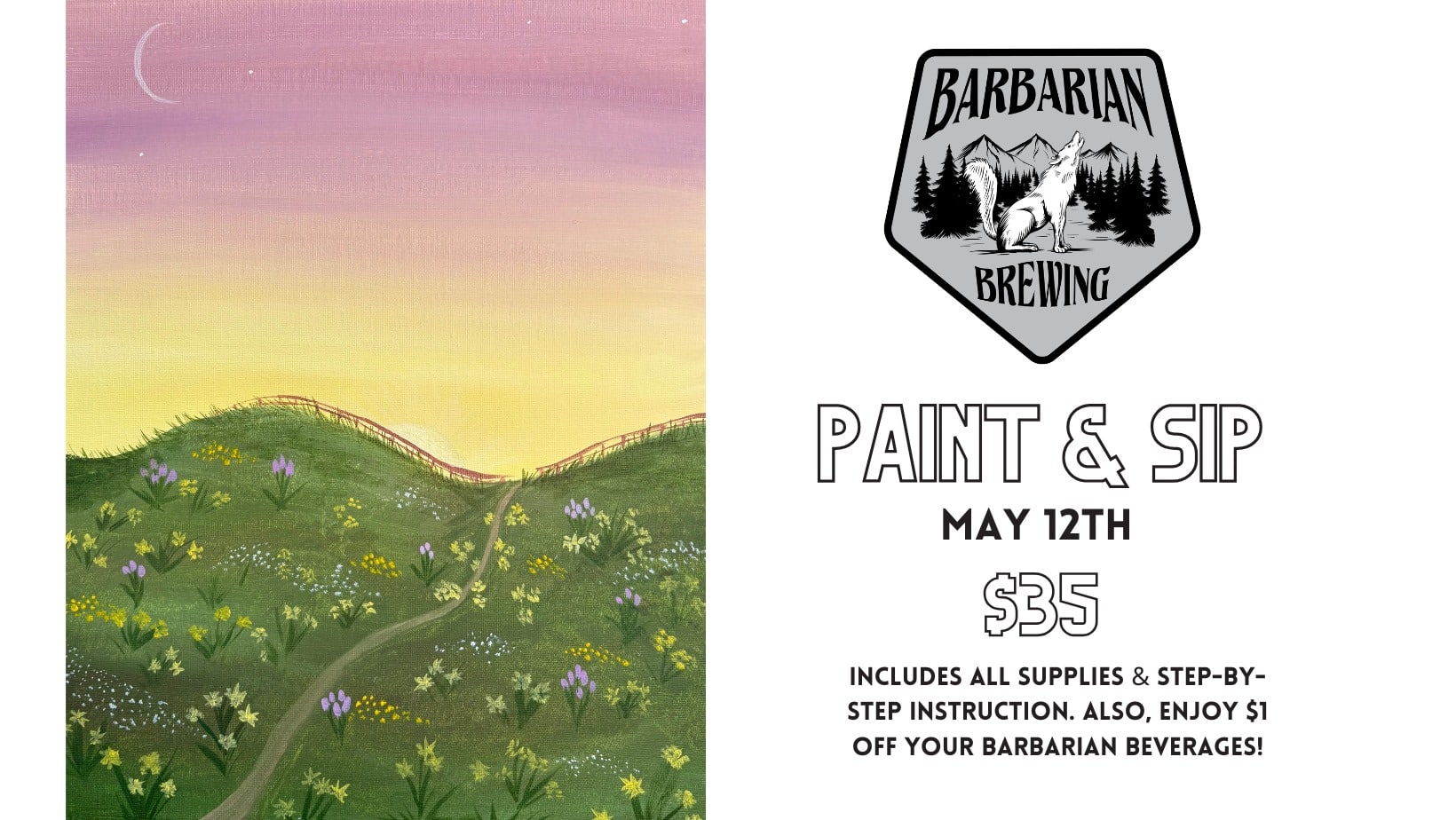 Let's hang out and paint together at Barbarian Brewing! All supplies & step-by-step instruction provided. Painters can also enjoy $1 off your Barbarian Beverages.