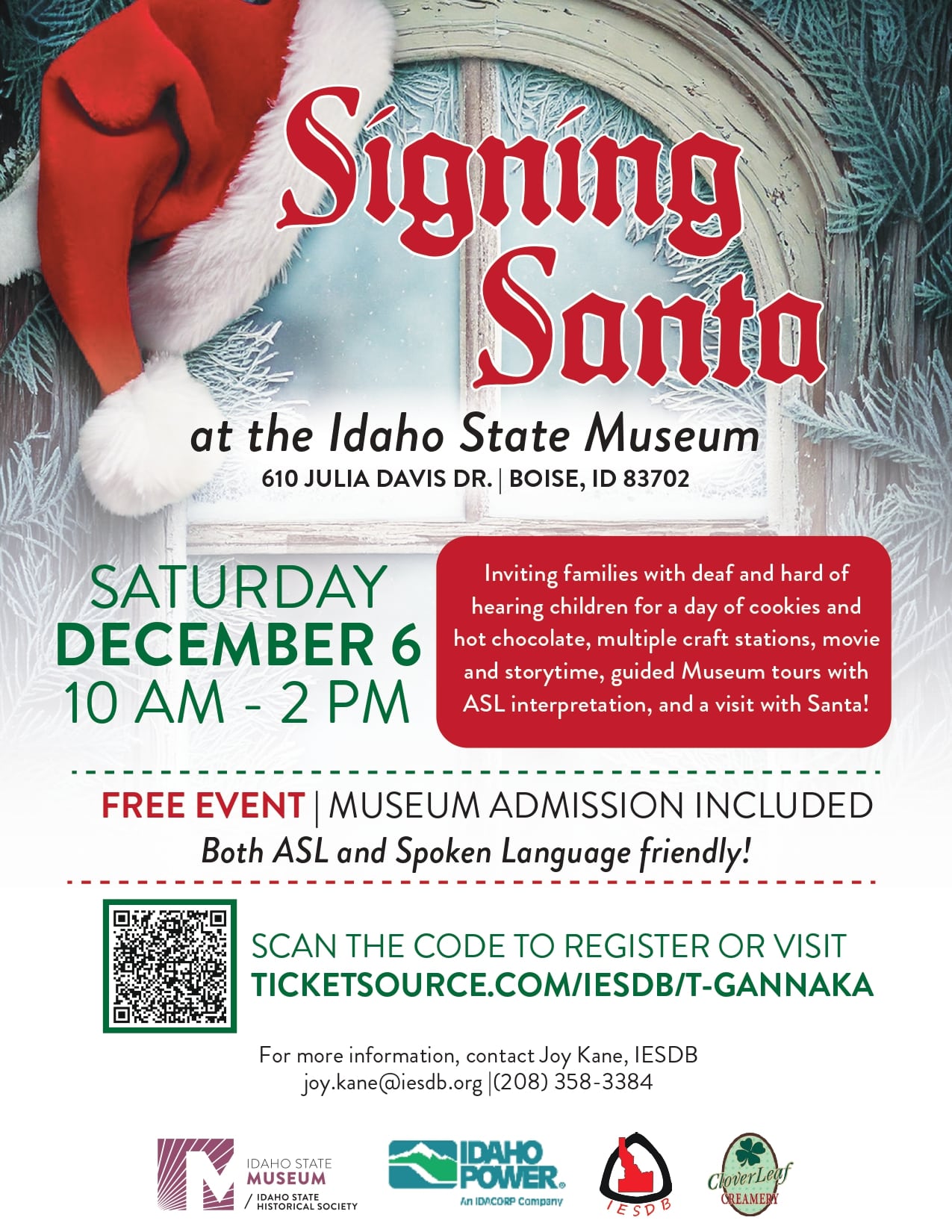 With the Idaho Educational Services for the Deaf and the Blind (IESDB), we’re excited to welcome Signing Santa to the Idaho State Museum! Families with deaf and hard of hearing children are invited to experience the magic of the holiday season.