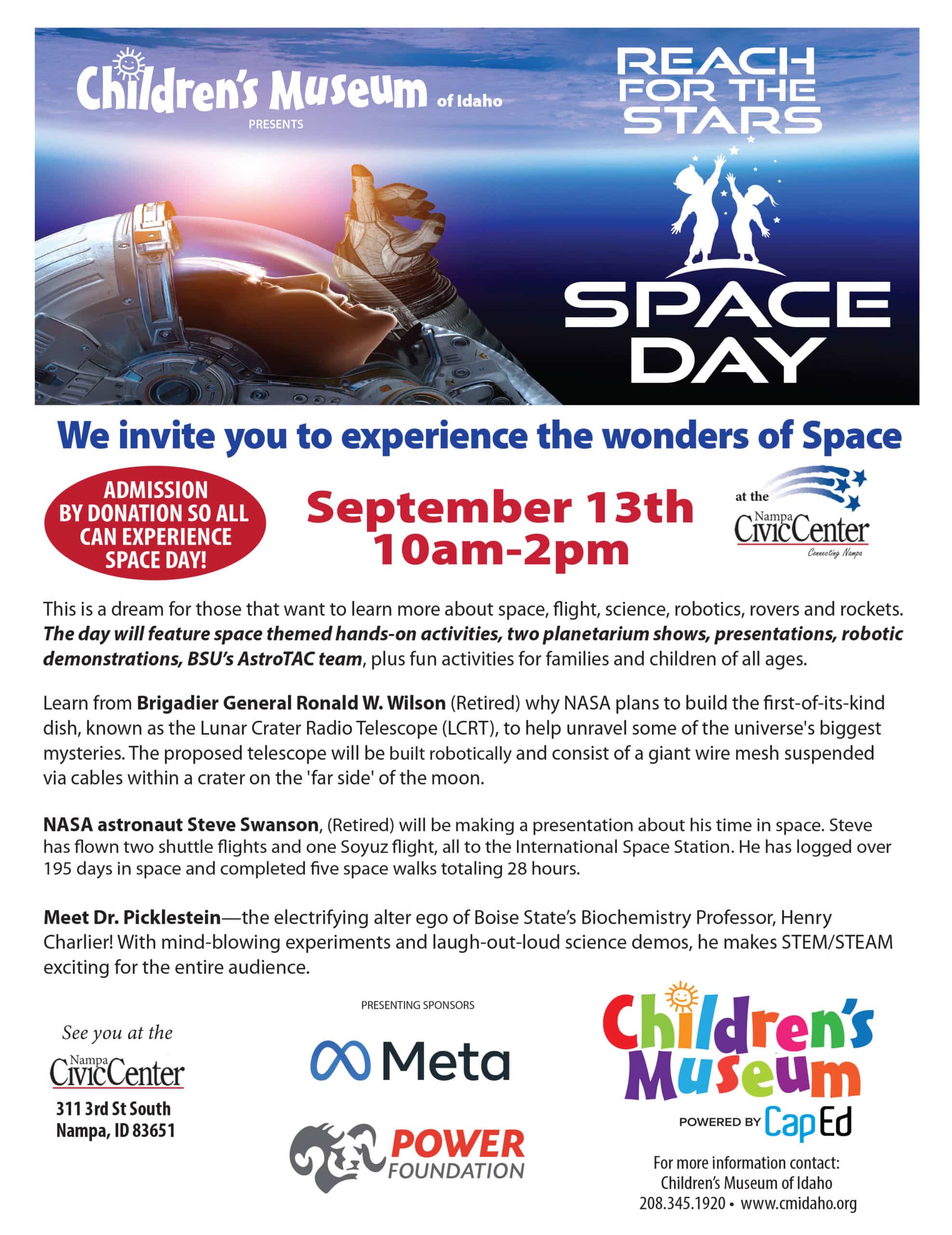 Join us Saturday, September 13th from 10am-2pm at the Nampa Civic Center for The Children’s Museum of Idaho’s ultimate space adventure!