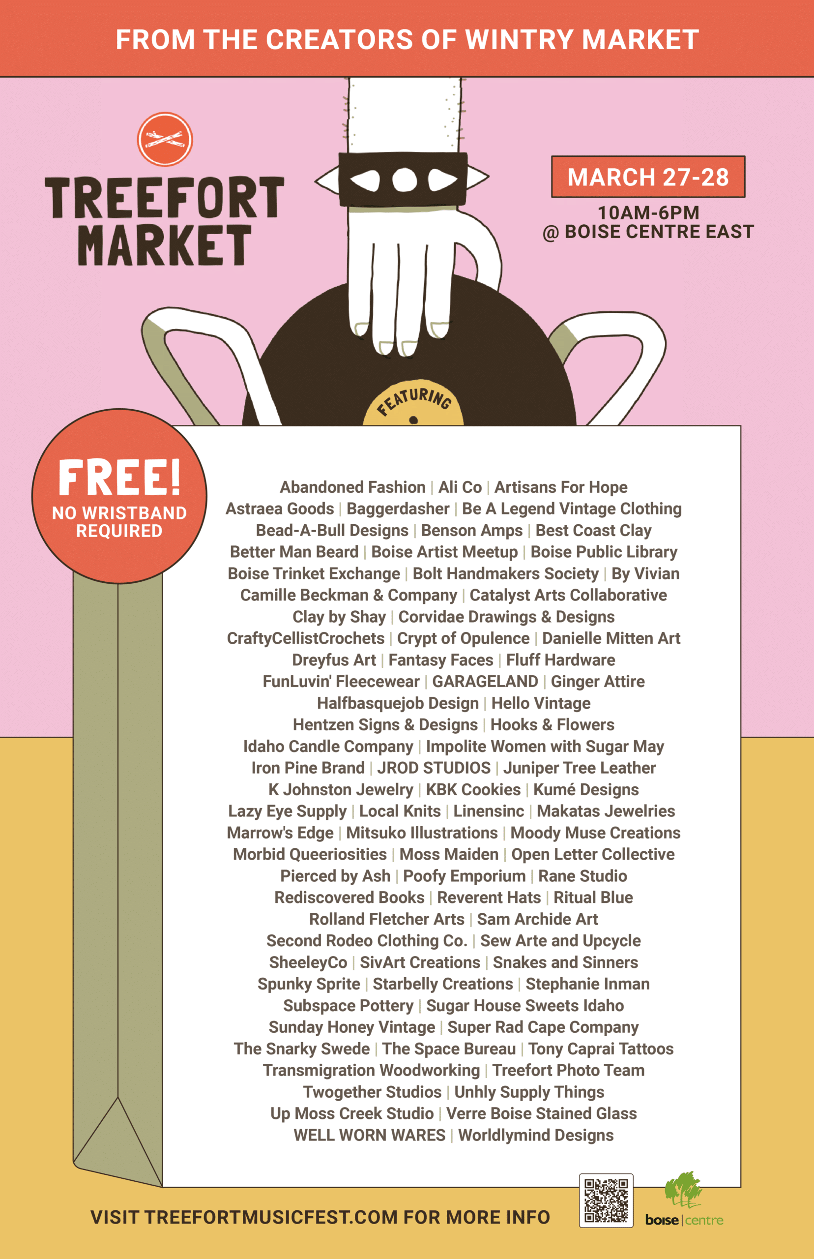 We are super excited to launch Treefort Market in 2026, a curated maker’s market showcasing the best of local and regional art, craft, design, vintage + music ephemera. Featuring 75 makers of innovative and original items, talks, workshops, art installations, and special events on Friday and Saturday 10am-6pm at Boise Centre East at 195 S. Capitol Blvd, Boise, ID 83702 and is open to the public, no wristband required! Treefort Market is our exciting new community feature in 2026, funded in part by Treefort For Good.
