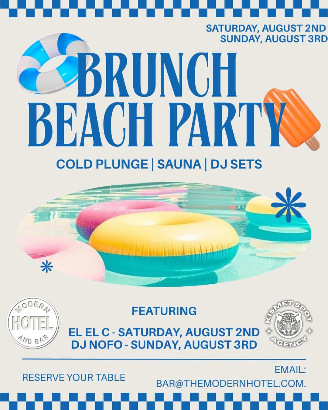 August 2 & 3, we’re continuing our first-weekend tradition — two days of killer food, great energy, and immaculate vibes. It’s the reset you didn’t know you needed! Brought to you by The Modern Bar, Kismet Spot Agency, and Sauna Social Club.