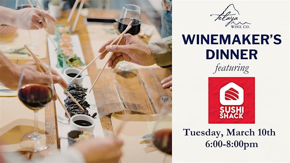 Join us for an unforgettable evening as Telaya Wine Co. partners with Sushi Shack for a winemaker’s dinner in Garden City, Idaho. This thoughtfully curated dining experience will feature multiple sushi courses, each designed to pair beautifully with Telaya’s wines. This evening celebrates the art of pairing, bringing together refined sushi courses and Telaya’s handcrafted wines in a setting designed for connection, conversation, and discovery.